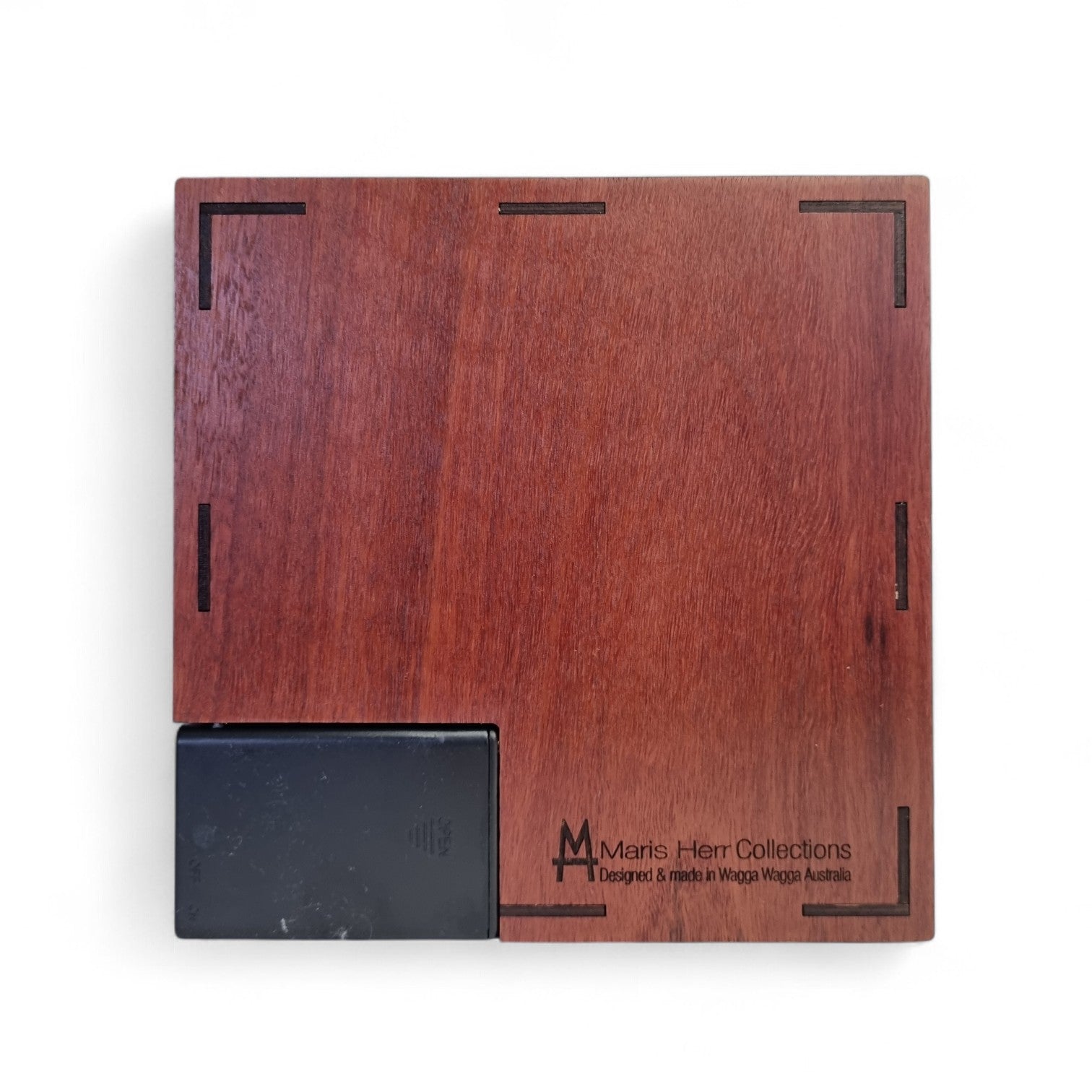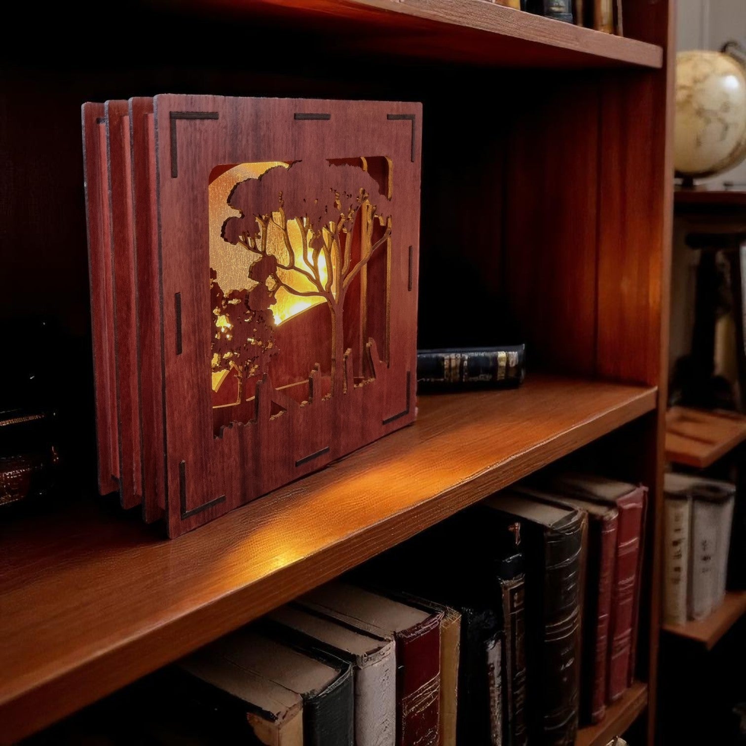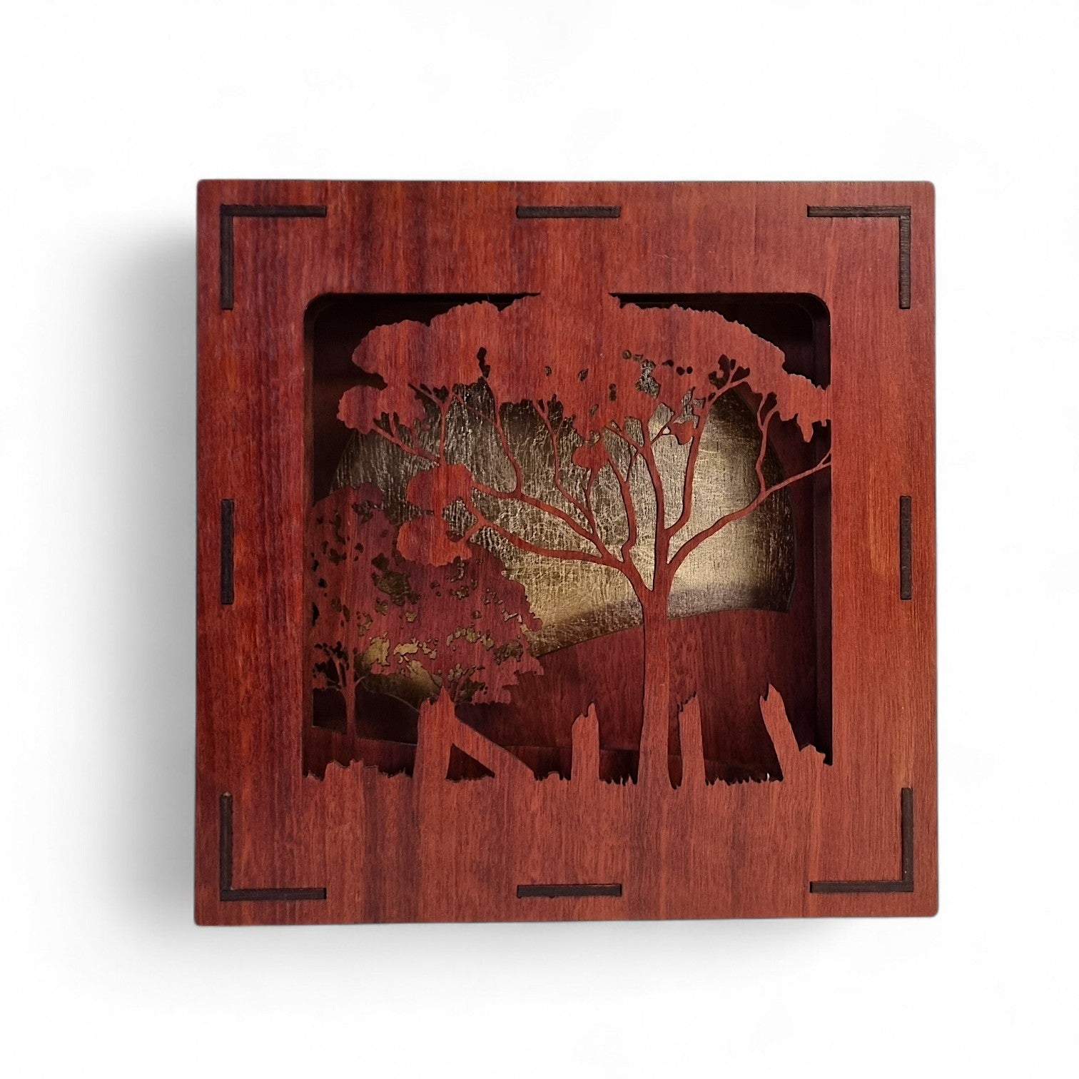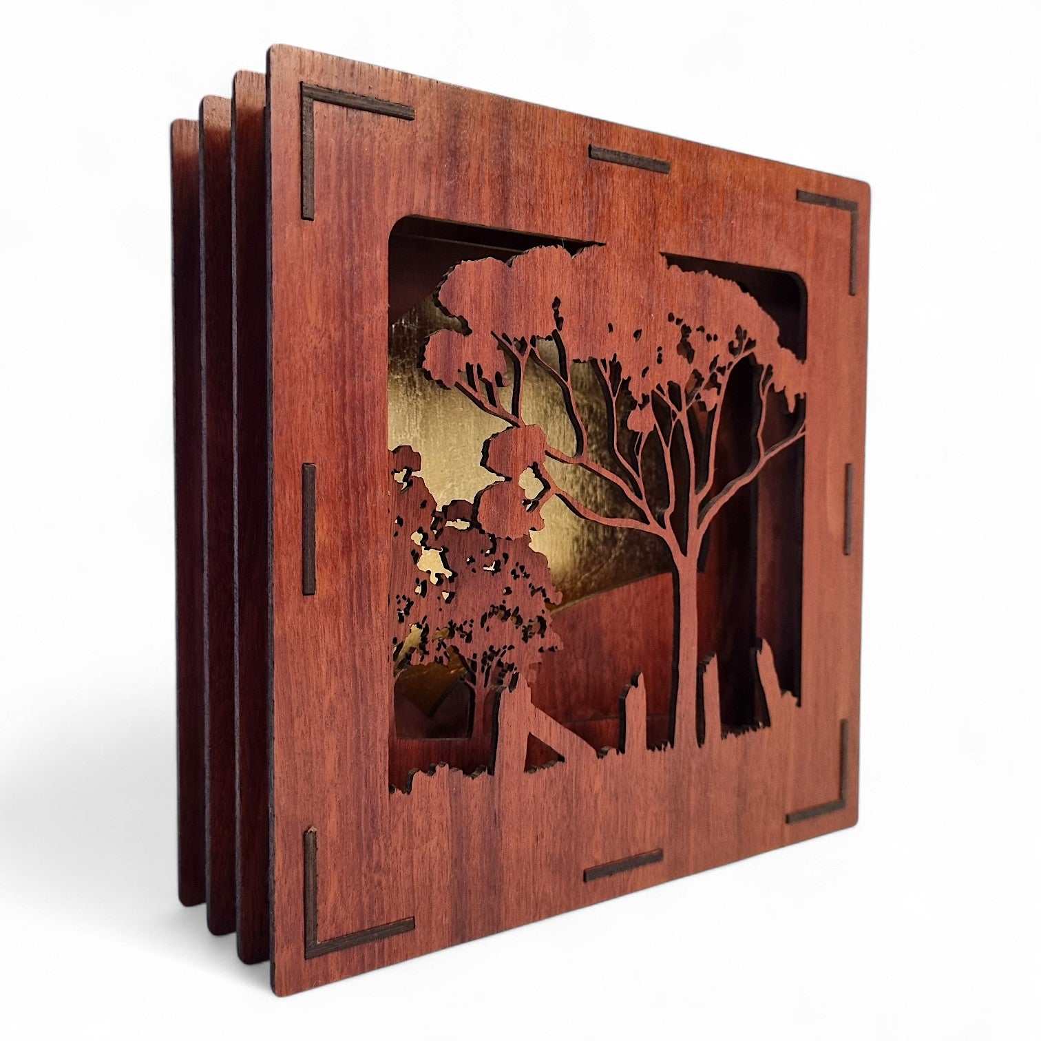 This charming nightlight, crafted from smooth timber, captures a sunset over the Australian landscape. Its detailed laser-cut design casts a warm, gentle glow that fills bedrooms, living rooms, or offices with a cozy and inviting atmosphere. Each piece is unique, showcasing the natural grain and character of the wood. Battery-operated and cordless, it’s an easy and portable way to add a snug glow wherever you fancy!