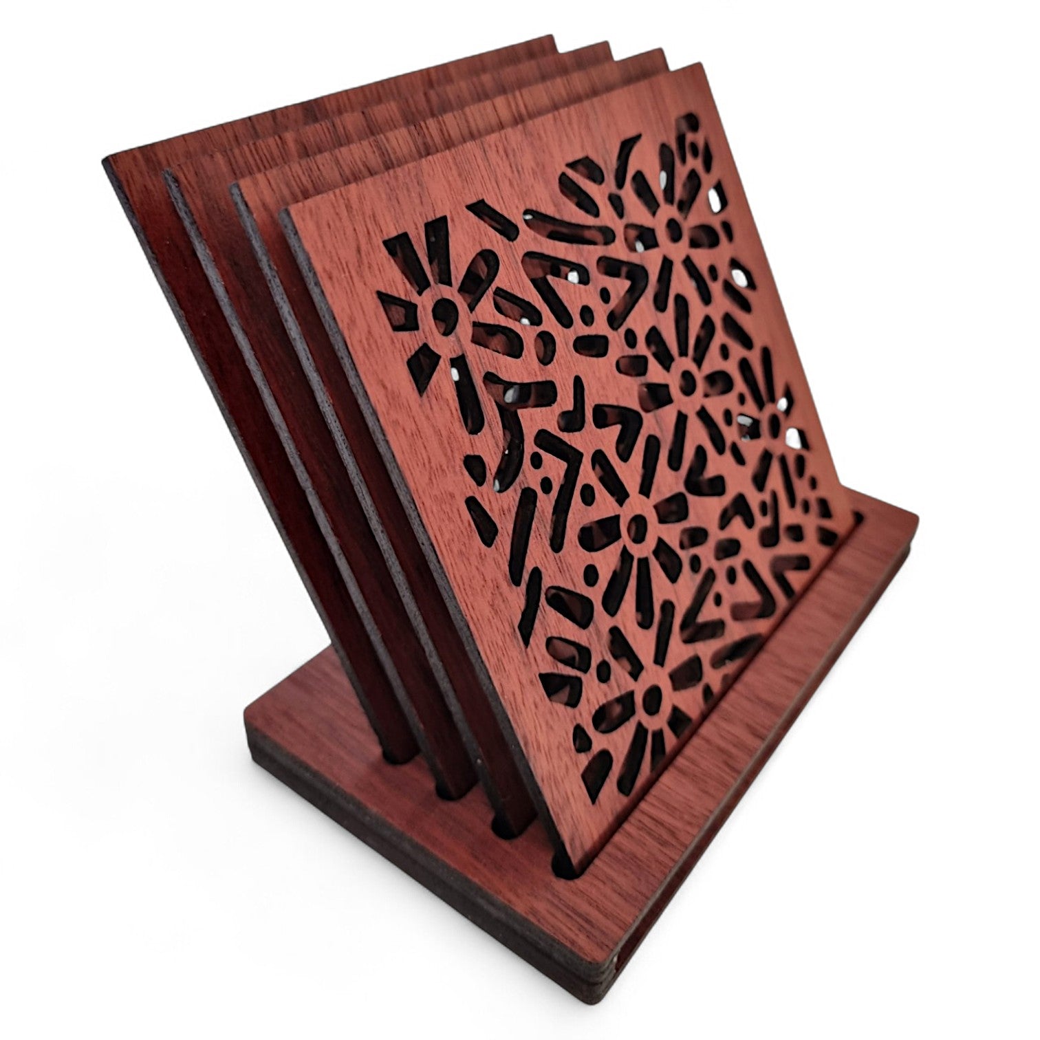 This set of 4 laser-cut coasters includes a sleek stand to keep them neatly stored when not in use. Designed to protect your surfaces from spills and stains, these coasters offer both practicality and style. The precise laser-cut details add a unique look, while the stand helps keep your space organized. Ideal for safeguarding your drinks and maintaining a clean, polished table.