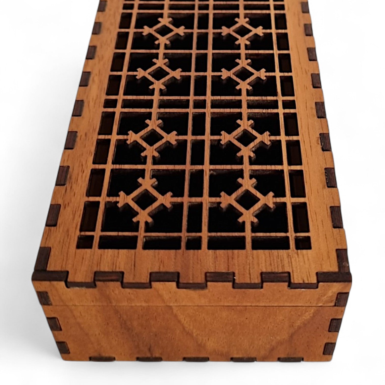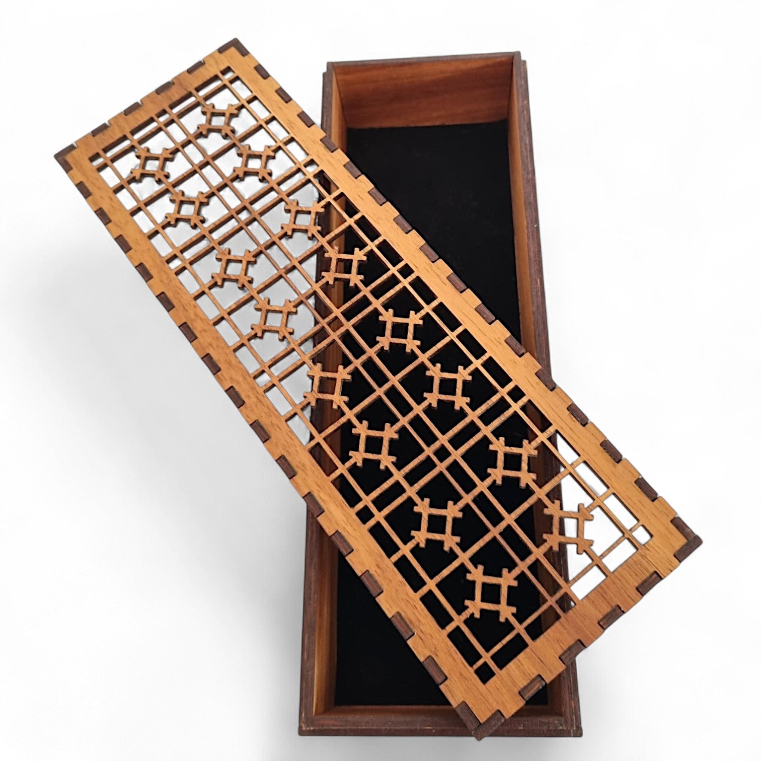 Organise your stationary and keep your desk tidy with this beautifully crafted laser cut pencil box. Made from a range of high quality timber veneers, the boxes feature precise, intricate designs achieved through state-of-the-art laser cutting technology. The natural timber grain adds a warm organic touch, while the sleek modern design keeps your desk neat and clutter free. Lightweight and durable, this pencil box is perfect for storing pens, pencils and small tools, blending functionality and artistry seamlessly. A thoughtful addition to any workspace or a perfect gift for creatives and professionals.