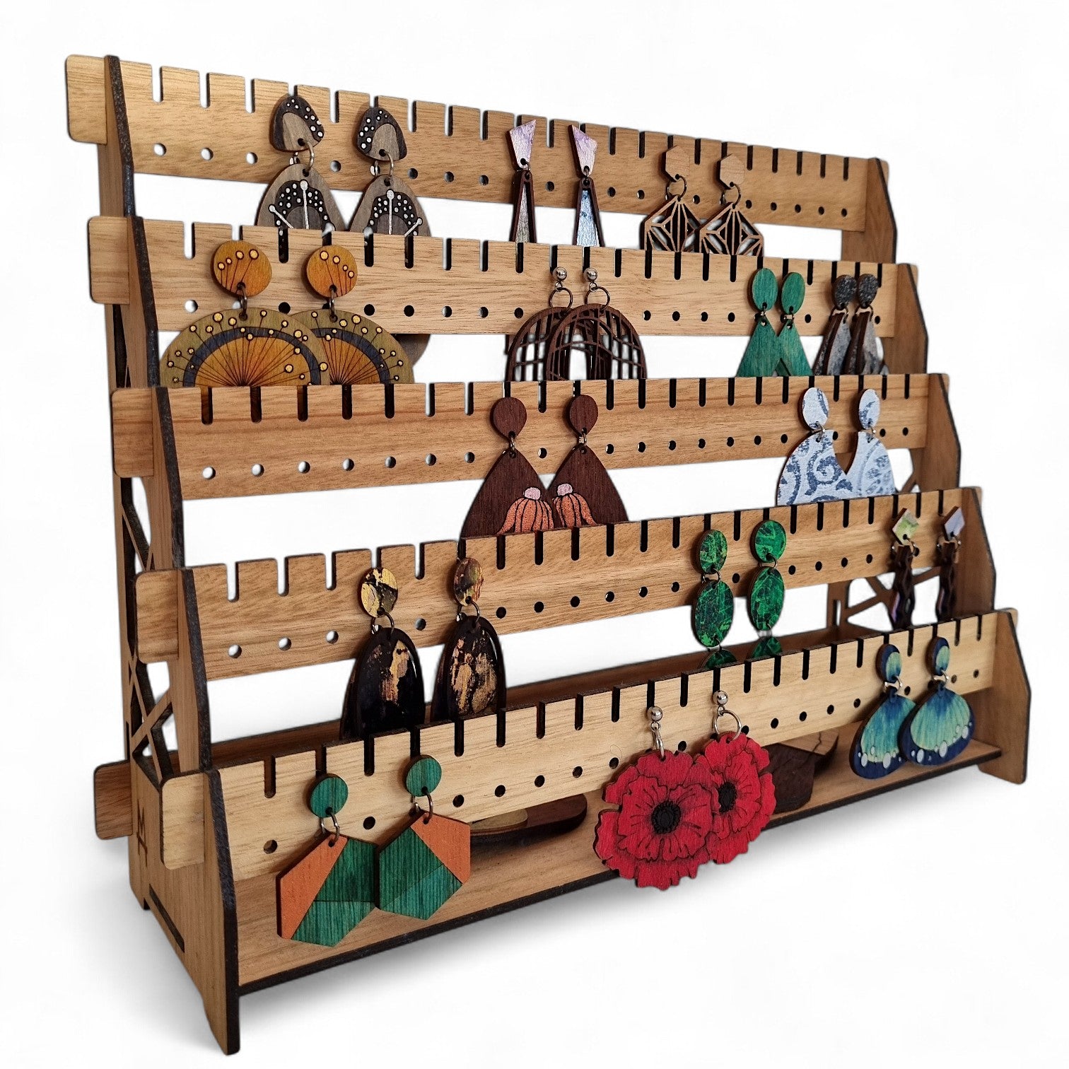 Shelf Earring Stand with Storage Tray Elevate your jewellery organisation with this elegant tabletop stand, designed to hold over 60 pairs of earrings while keeping everything neatly within reach. Its flat-back silhouette sits flush against a wall or mirror, creating a sleek profile that's ideal for vanities, dressers, or boutique countertops.