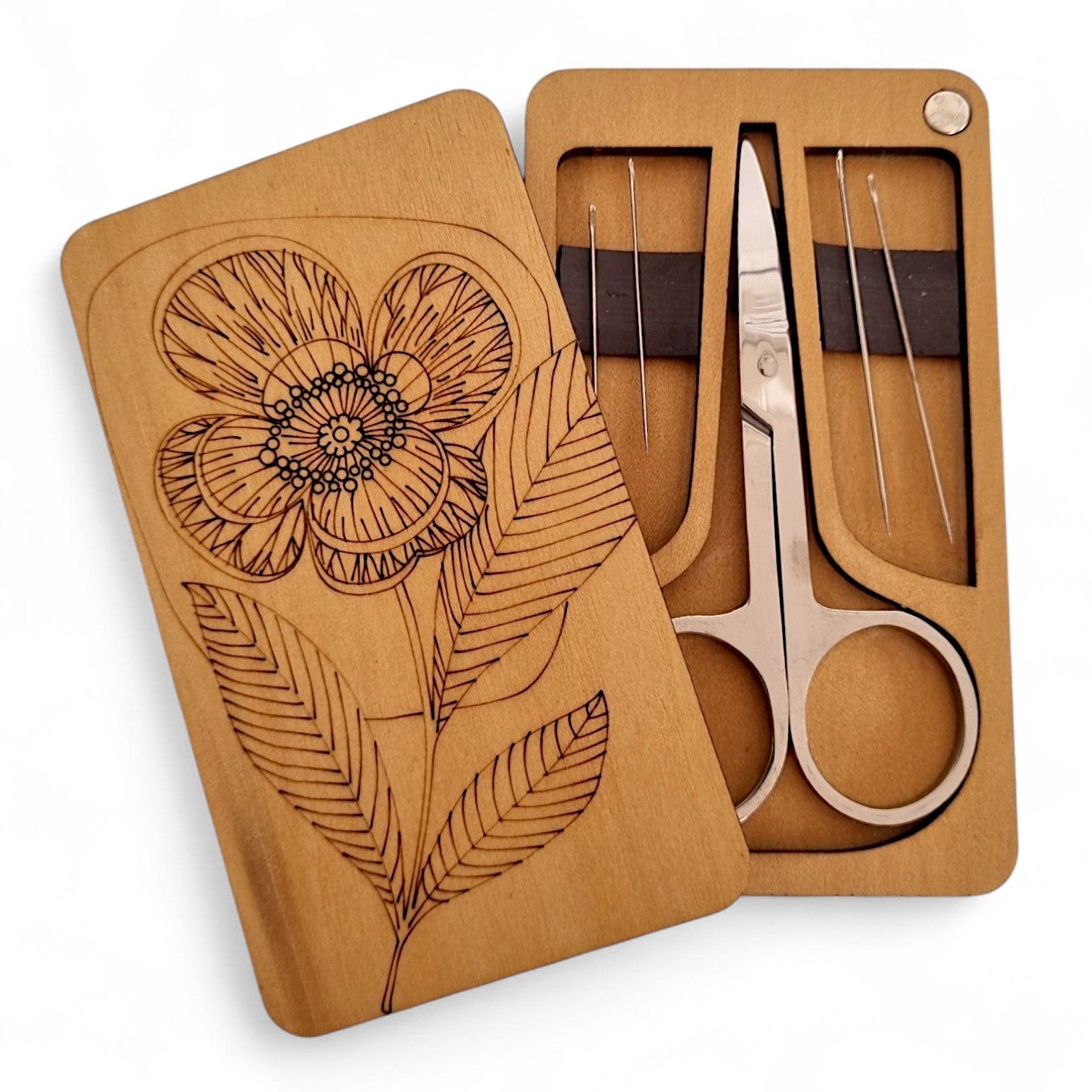 This charming Needle Case is a delightful way to keep your sewing essentials organized. Crafted with precision laser cutting and featuring a beautifully laser-engraved design on the cover, it snaps shut securely with magnets. Inside, you'll find handy small scissors and a selection of needles to kickstart your creative projects. Perfect for stitching on the go or brightening up your craft space!